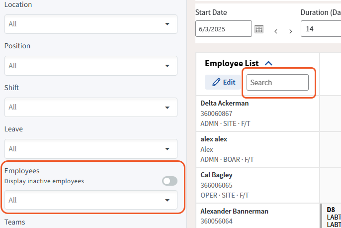 There are two ways to filter for employees. You can use the quick search under the Employee List to search by last name or employee ID, or search for multiple employees through the employee filter in the left side panel.
