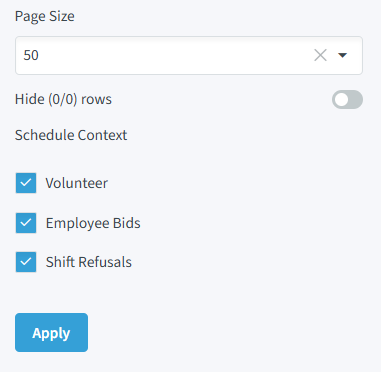 Users can choose to see additional information about employees within the employee list on the schedule. Depending on your organization's configuration, you can choose to view volunteers, bids, refusals, or work records within the employee's shift/leave cell.
