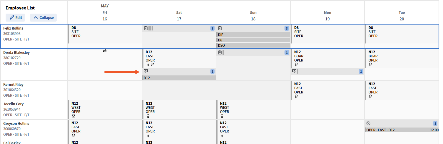 Once enabled, you will see the various icons populate within the employee's schedule if utilized. To see more details, click on the icon to expand the results.