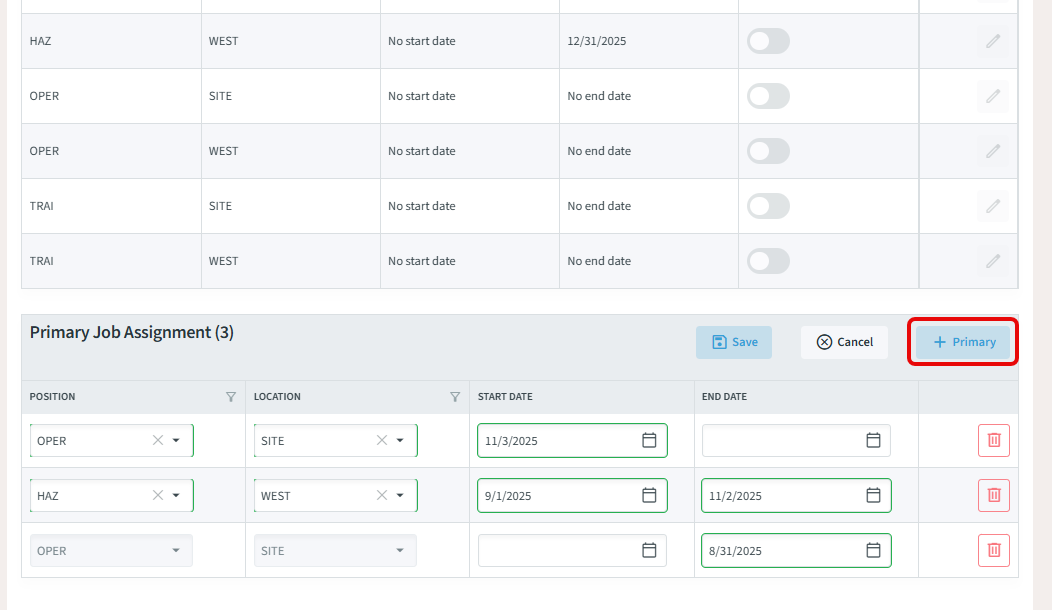 - Users with permission can add a new Primary Job Assignment by clicking the Edit button.